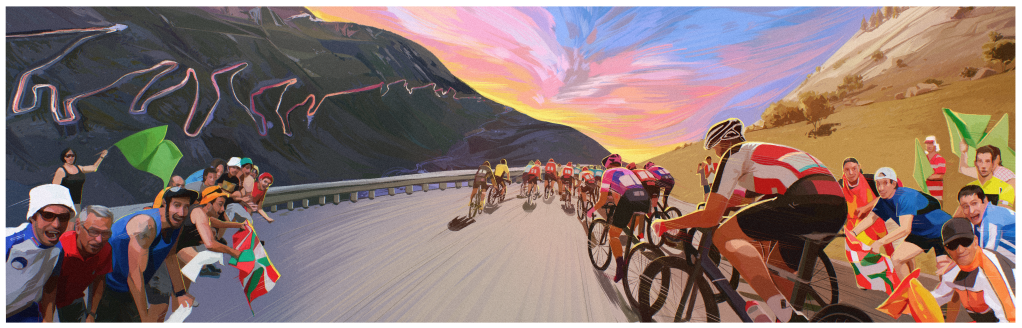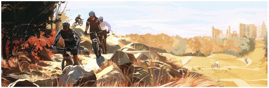 In November 2025, I created illustrations for Mike Vaughan Cycles in Kenilworth to be printed and installed in their display windows. The left window was focused on rides local to the area, featuring Kenilworth Castle and Newbold Comyn bike park whereas the second was a more fantastical look at the road cycling scene. In the second design, I combined views from famous riding spots in the Alps and Mallorca, as well as the iconography of crowds cheering on riders of the Tour de France.